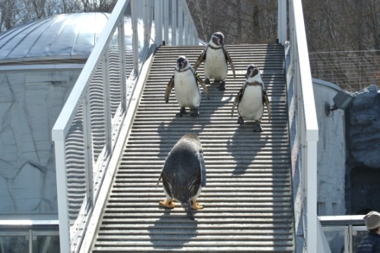 旭山動物園、スロープを降りてくるフンボルト3羽を単独迎え撃つジェンツー、みたいな構図ですが。ーーーーー...