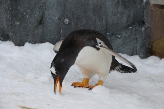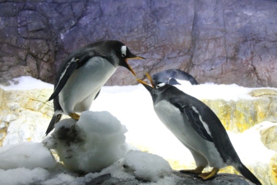 海遊館のジェンツー、雪塊の出っ張りに片足かかってます。崩れて落ちても下はプールなので大丈夫でしょうが...