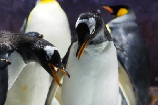 「こわっ、コドモ喰うとるがや」と怖がっているわけではない手前のアデリー。名古屋港水族館のジェンツー親...