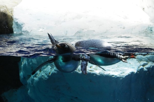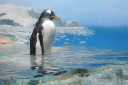海遊館のジェンツー、プカプカと水に浮かんで遊んでいます。白いハラが真珠のような光沢をおびて、妖しい魅力。