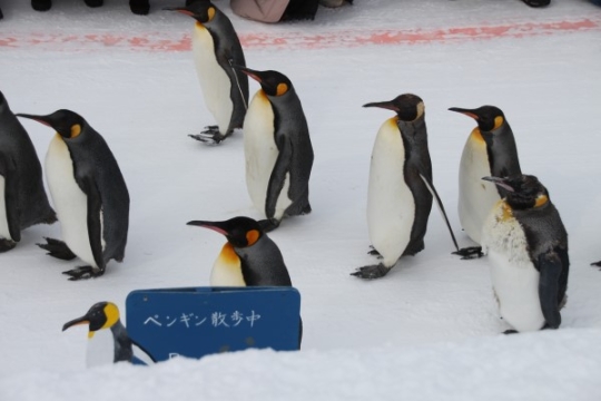 「ペンギン散歩中」看板の横を通る旭山キング集団。看板に重なっている1羽が、なんだか看板の一部に見えます。