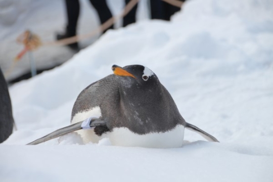 前回写真で元気に登場したおたる水族館のジェンツーたち、広場に出ると各自好きなように雪を楽しみます。寝...