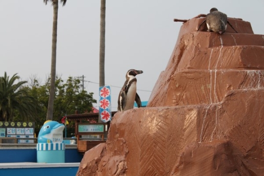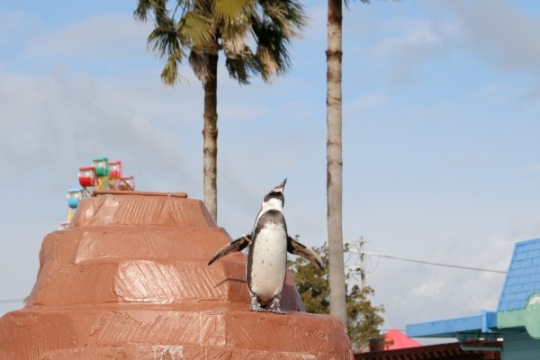 ペンギン山の八合目付近に立つフンボルト。背景には観覧車とヤシの木。さあ、ここはどこ?南知多ビーチラン...