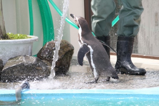 「ひとつ、やっとくれやす」と、飼育員さんに何かお願いしているふうのフンボルト。京都市動物園ペンギンプ...