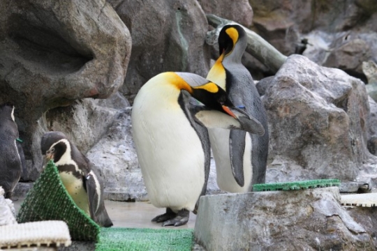 優雅に羽繕いするキングの傍らで、プラスチックマットを持ち上げるフンボルト。真剣な面持ちです。ーーーー...