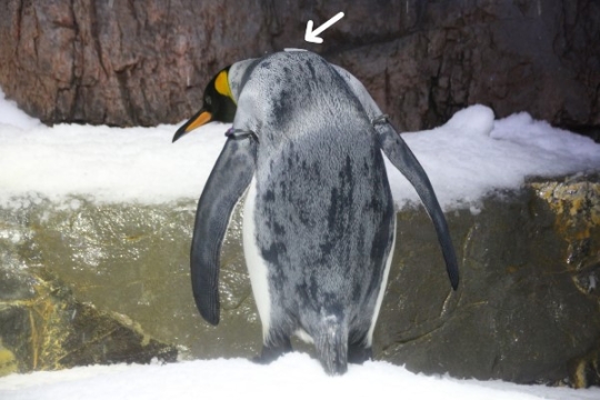 海遊館のキング、換羽中の図。ヒナの羽が生え替わるところではありません。年に1度、古い羽を落として新し...