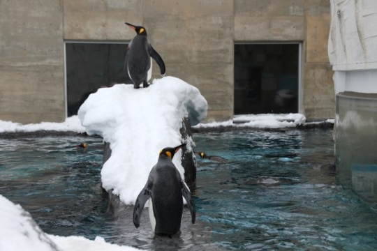 飛び込むの? 降りてくるの? 次の方が待ってますよ。ペンギンプールの小島にも雪が積もっています。ここ...