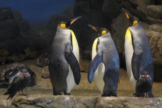 アドベンチャーワールドの海獣館プールを悠然と泳ぐペンギン。上はキング、下はエンペラーです。エンペラー...