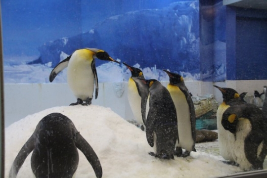 アドベンチャーワールドのペンギン王国に出現した雪山。てっぺんの座をめぐって団体交渉、みたいに見えるキ...
