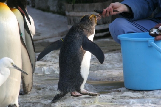 なつかしの上野ペンギンプール、給餌風景です。サカナをもらうマカロニ、列を作って待つキング、とコサギ。...