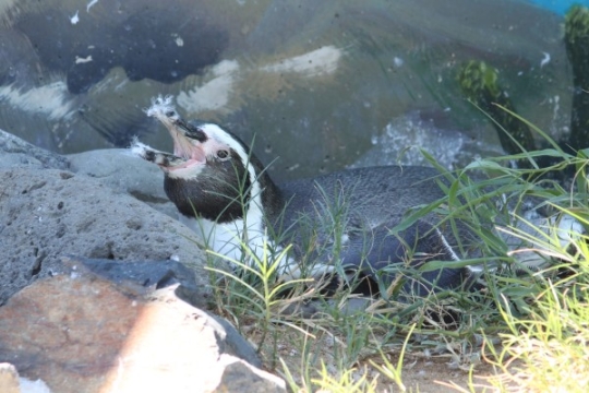 海響館にはフンボルトペンギンのプールがいくつかあります。その一つでは、ほっぺの白い亜成鳥から顔だけオ...