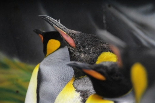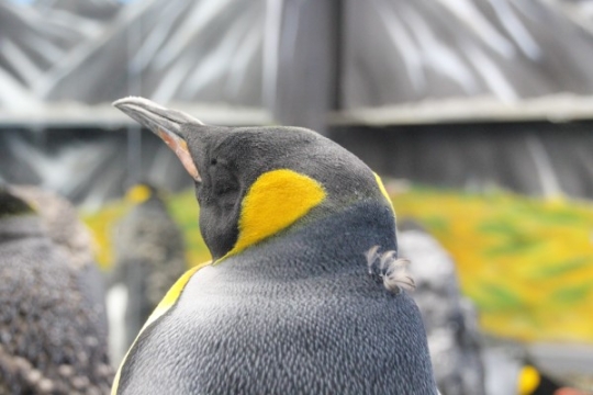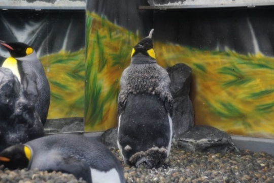 海遊館のキング、換羽中の図。ヒナの羽が生え替わるところではありません。年に1度、古い羽を落として新し...