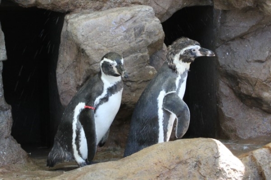 ある夏の京都市動物園、フンボルトの皆さんがペアごとに巣穴に入って日差しを避けていました。よく見ると、...