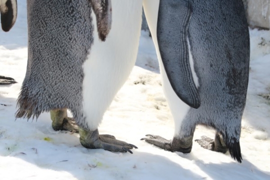 海遊館のキングたち、真新しい羽毛に身を包み、そろって体をうにょーんと伸ばしています。何をしているので...