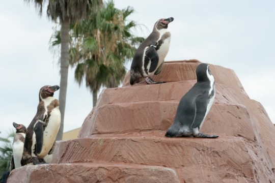 南知多ビーチランドです。ヤシの木を背景に、ペンギン山のてっぺん近くですまし顔のフンボルトたち。フンボ...