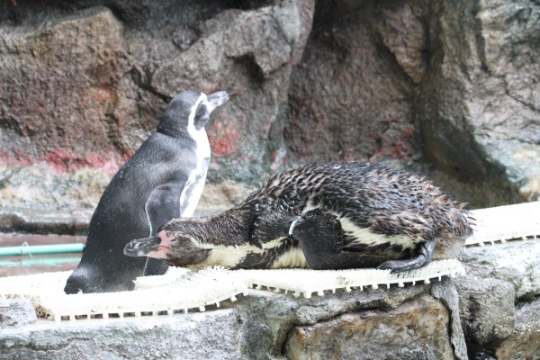 かりゆし水族館のフンボルトヒナちゃん、お父さんを枕にしてお昼寝を続けています。ヒナとは言っても、ほわ...