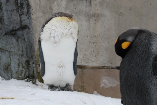 ゴージャスなファーに地味なお顔。だれ?別種? いいえ、キングのヒナから亜成鳥への変身、最終段階です。...