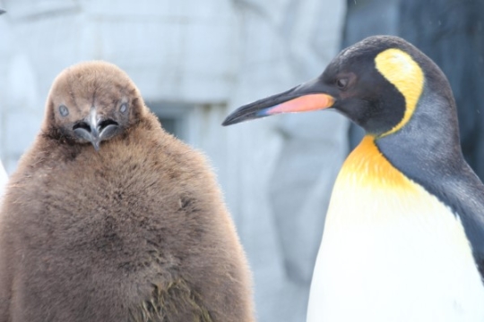 「まったくこの子は・・・」と思っているみたいに見える旭山キング母さん。ヒナの『中身』はもうオトナと同...