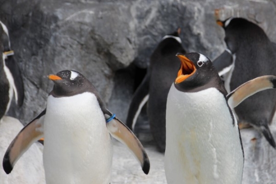 登別のジェンツー、大きなアクビ。普段は左の1羽みたいにすまし顔なんですが、口を開けると目の下まで裂け...