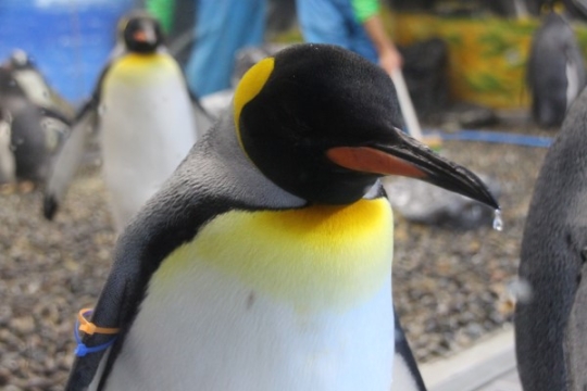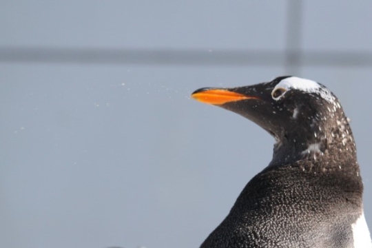 名古屋港水族館のジェンツー、首を左右にびゅっと振ったところです。クチバシから水滴が飛び出しているの、...