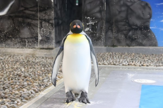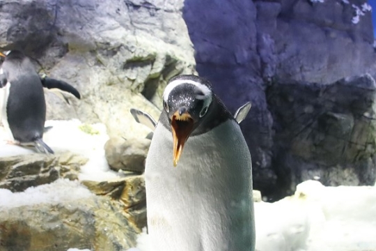 なんかコワイ。歯をむき出している? 黄色いチョビ髭が生えている?前回と同じ海遊館のジェンツーがノビを...
