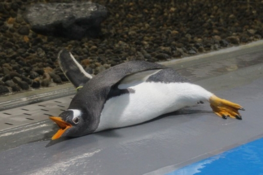 プールサイドに寝そべって、気持ちよさげに伸びをするジェンツーペンギン。お口の中を見ると、外側と同じ鮮...