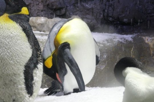 こちらは海遊館のキング。前回のイワトビと同じようなところをクチバシで掻いていますが、上半身だけ曲げて...