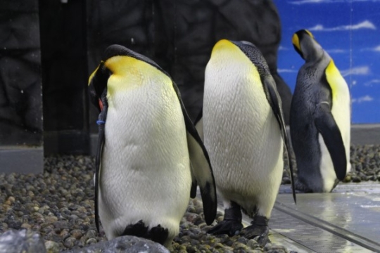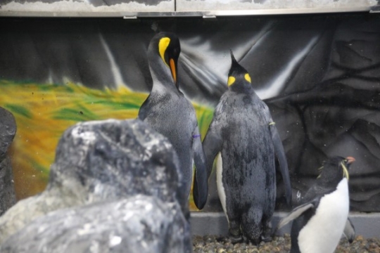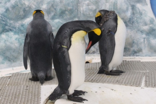 海遊館のキングたち、真新しい羽毛に身を包み、そろって体をうにょーんと伸ばしています。何をしているので...