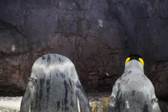 夏の終わり、海遊館のイワトビたちです。手をつなぐようにしてじっとしているペア。右側は旧羽がかなり抜け...
