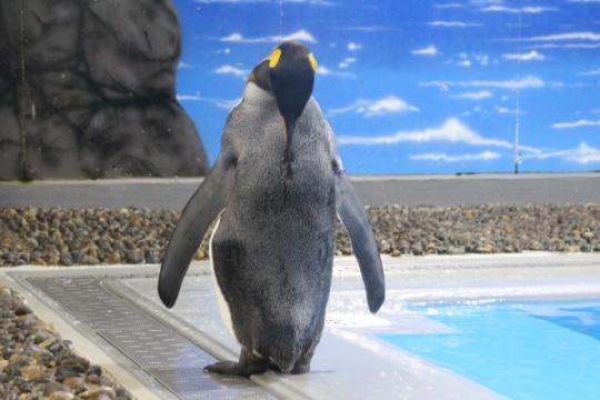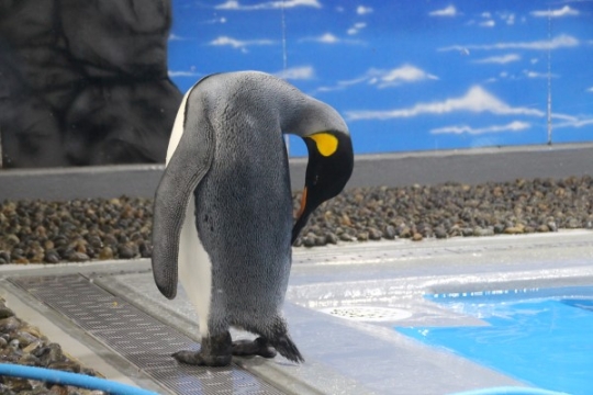 首ナシになっているキングは、胸の羽づくろい中。海遊館にて。