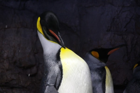 海遊館のキングが首の付け根あたりをクチバシでチュクチュク。平常スタイルで立つ奧のキングと比べると、す...