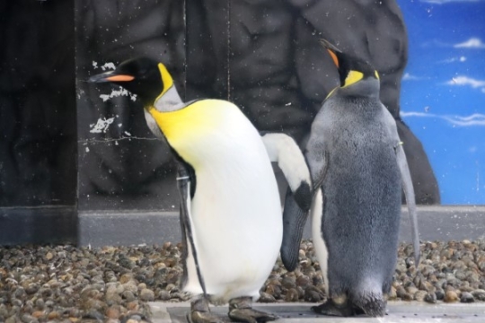 名古屋港水族館の仲良しエンペラー、そろって首を曲げています。曲げ方がすごいですが、背中に頭をこすりつ...