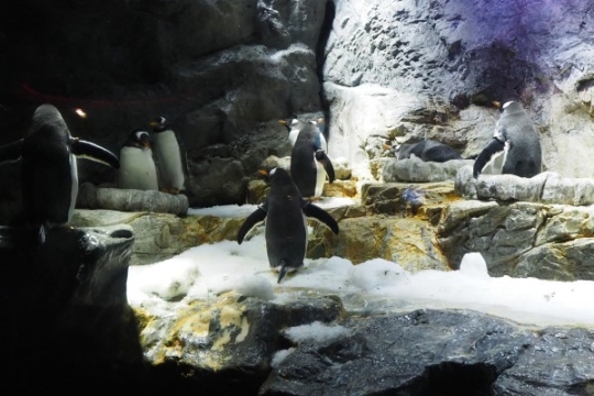 3月の同じ頃、海遊館のジェンツーたちはそろそろ場所取りの季節。ペアで好みの巣台を選び、巣材を運び込む...