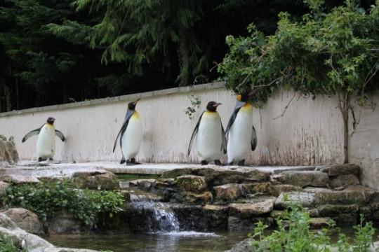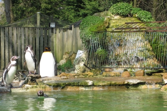 バードランドのペンギンプール、2010年の写真です。ペンギンたちは塀沿いにプールサイドを歩いて奥の方まで...
