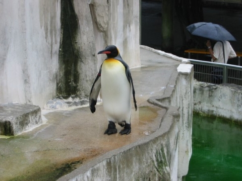 テラスにひとり佇み雨に打たれるキング。通る人はカサをさしていますが、ペンギンは完全防水!なので濡れて...