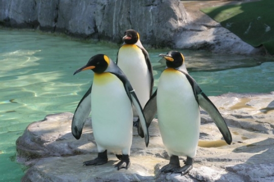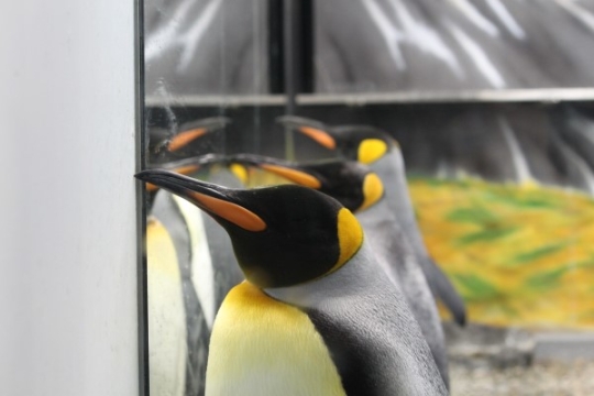 越前松島水族館のキングたちは、鏡の前がお好き。等間隔で鏡に向かって立っています。手前の1羽は、場所が...