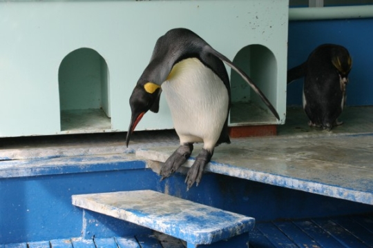 福岡市動物園にキングがいた頃、休憩コーナーの近くに、ペンギンプールが通路をはさんで2つありました。一...