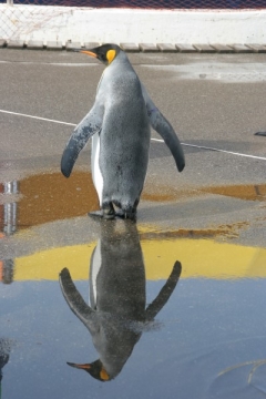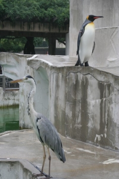 名古屋東山動植物園の旧ペンギンプール、キングペンギンとアオサギ(野生)の共演風景。正門からまっすぐに...