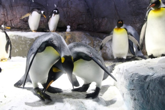 海遊館のキングが2羽でいちゃついていました。一段上からそれを見ているキングがいます。ーーーーーーーーー...