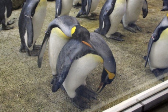 アドベンチャーワールドのペンギン王国。ガラス際でぺったりくっつく仲良しキングのペアがほほえましい。こ...