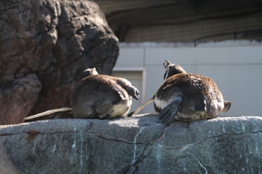 海遊館のイワトビ夫婦、タマゴを2つあたため中。「そろそろ交代しよか。」 「そやな、よっこらせ~。」抱...