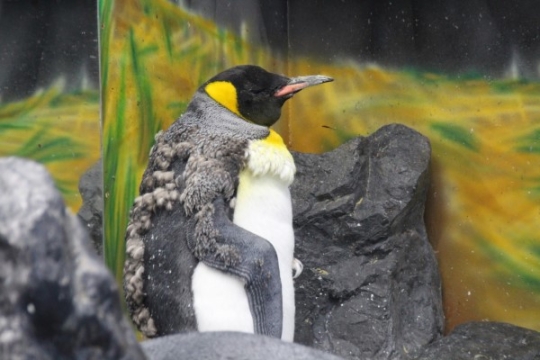 海遊館のキング、換羽中の図。ヒナの羽が生え替わるところではありません。年に1度、古い羽を落として新し...
