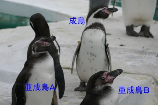 天王寺動物園のフンボルト、成鳥と亜成鳥2羽です。亜成鳥Aは先輩、Bは後輩です。成鳥と見比べてください...