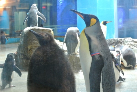 長崎ペンギン水族館で見たキングのヒナ。ほわほわ幼綿羽は保温性抜群ですが、撥水性はないので泳げません。...