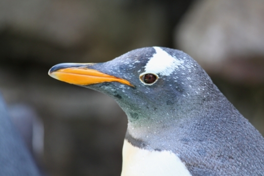 登別マリンパークニクスのキング。キングの側頭部には鮮やかな黄色の模様があります。胸元は同じく濃い黄色...