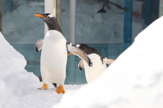 おたる水族館の雪上散歩に飛び出してくるジェンツー、元気いっぱいです。雪の上にクッキリと目立つオレンジ...