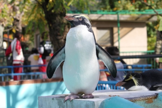 アドベンチャーワールドで見かけたこのペンギンは、何ペンギン?目は目立たなくて、目の上に白っぽいライン...