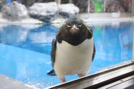 「やんのかコラ!」 「ゆるさんで!」 キングとイワトビの激しい?にらみ合い。越前松島水族館のぺんぎん...