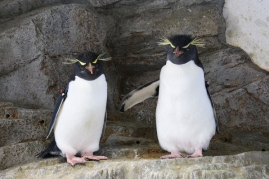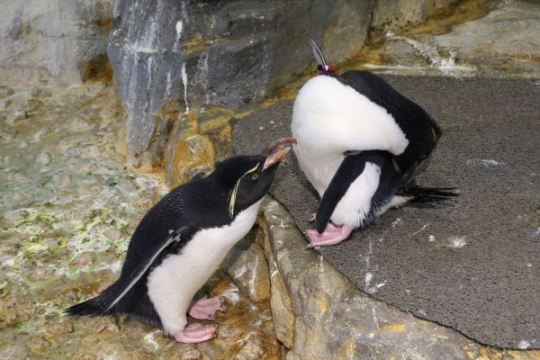 海遊館のイワトビ、ペアでくつろいでます。左のイワトビのクチバシ、相方のハラに突き刺さってる?みたいで...