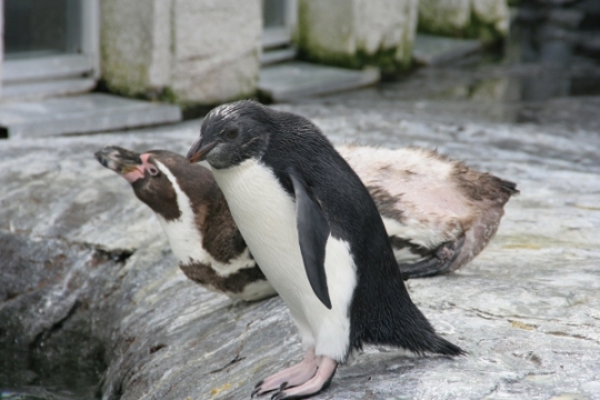旭山動物園です。寝ころんでいるのは、背中だけ換羽に入ってしまったフンボルト。手前に立っているのは何ペ...